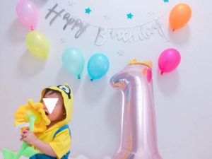 飾り付けが面倒な場合でも、特大バルーンさえあれば、膨らますだけで存在感があるし、それなりに誕生日っぽい写真が撮れると思います。
