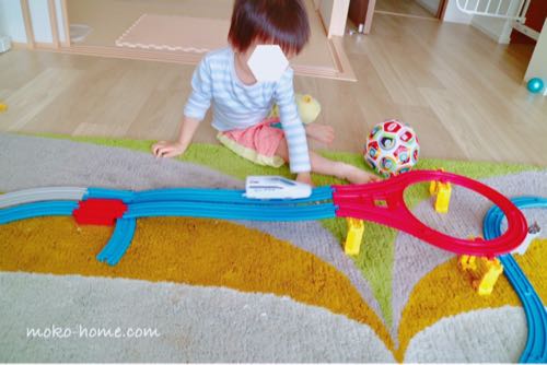 広げた当日からプラレールに夢中で、本当に電車が好きなんやなあと思いました。